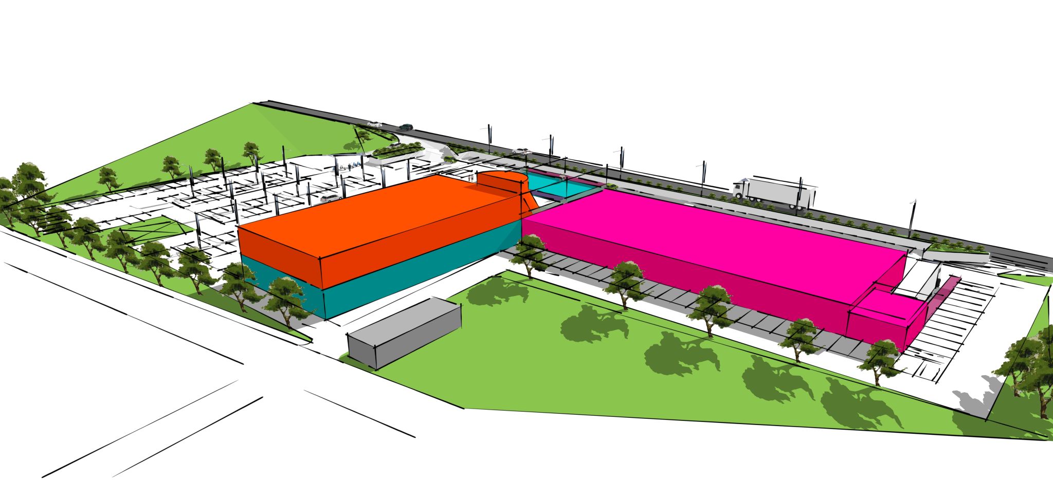 Un polo di intrattenimento e servizi pensato per essere molto più della somma delle sue funzioni. Il cinema multisala è il cuore pulsante dell'intervento, attorno a lui si organizzano spazi commerciali, aree ristoro e luoghi di socialità , in un sistema architettonico unitario dove ogni volume ha un ruolo preciso e un'identità visiva riconoscibile. Colori forti, forme nette, una rooftop che guarda fuori. Un progetto che non vuole passare inosservato.